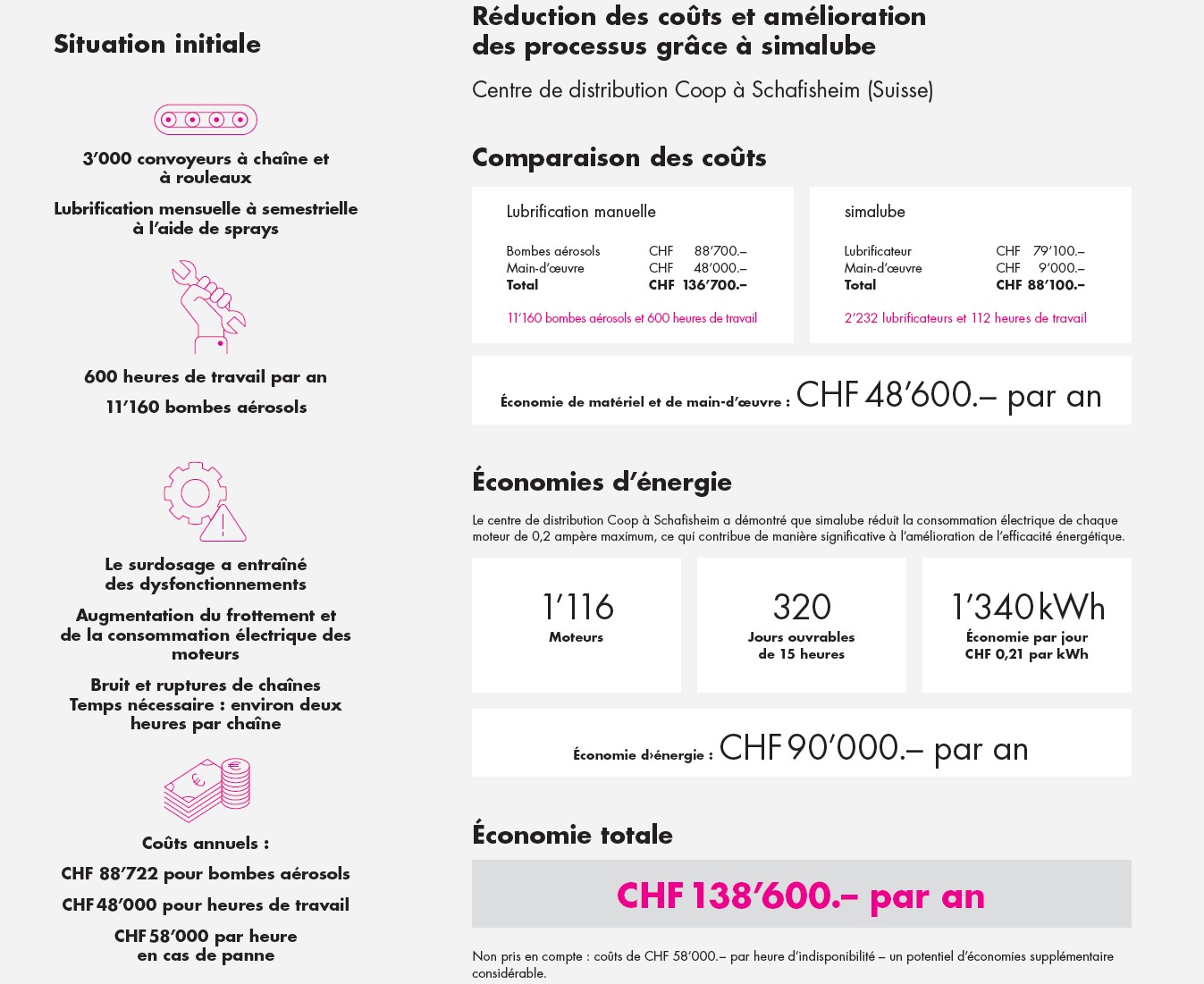 - Réduction des frais d'entretien et de maintenance : la lubrification manuelle est supprimée, ce qui permet un gain de temps considérable